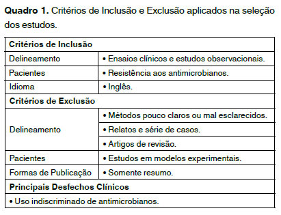 A estratégia de busca utilizou as seguintes combinações de palavras-chave: (“Drug Resistance, Microbial”[Mesh]) AND “Microbial Resistance”. Para identificar os delineamentos dos estudos, foram empregados os seguintes termos: Observacional Study, Randomized Controlled TrialClinical Trial e Humans. Para a seleção dos estudos, foram aplicados os critérios de inclusão e exclusão apresentados no Quadro 1.