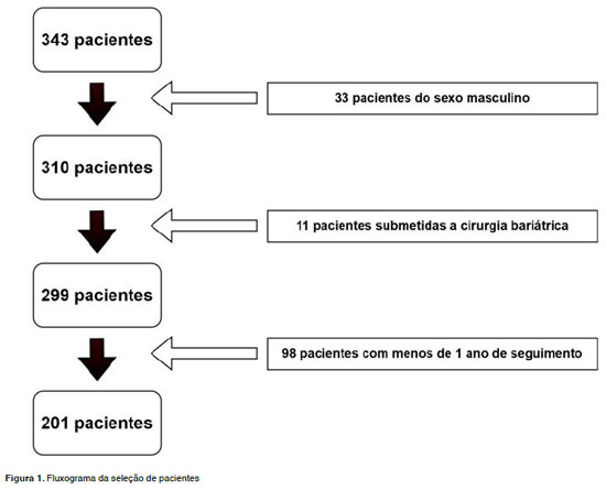 Critérios de exclusão: pacientes acompanhadas por tempo inferior a um ano, com dados incompletos no prontuário, submetidas à cirurgia bariátrica, impossibilitadas de mensuração de peso e altura e/ou as que compareceram a menos de 80% das consultas.