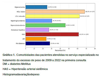 Dentre as comorbidades associadas à obesidade, HDL baixo foi a mais prevalente no início do tratamento, seguida de LDL elevado e hipertensão arterial sistêmica (HAS), conforme evidenciado no Gráfico 1. Disglicemia, incluindo Diabetes Mellitus (DM) e pré-diabetes foi vista em 104 pacientes (51,8%).