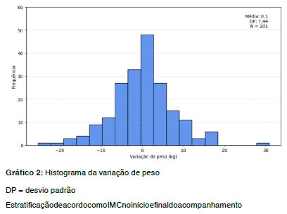 A variação do peso foi de -25,3kg a 30,8kg, com média de 0,1±7,4kg (Gráfico 2).