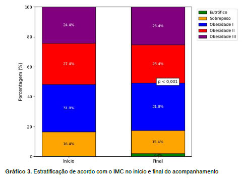 Ao final do acompanhamento, 2% (4 pacientes) da amostra alcançaram normalidade do IMC e o percentual de obesidade passou de 83,6% para 82,6% (p<0,001), conforme detalhado no Gráfico 3.