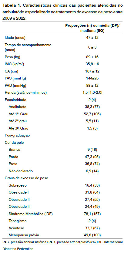 RESULTADOS: a amostra foi composta por 201 mulheres, com idade de 47±12 anos, IMC de 35,8±6kg/m2, renda 1,5[1,0-2,0] salário-mínimo e tempo de seguimento de 6±3anos. A variação de peso foi de 0,1±7,4kg, oscilando entre -25,3kg a +30,8kg. A amostra apresentou melhora dos níveis de LDL (128±40 x 115±35mg/dL, p<0,001), HDL (45±11 x 50±11 mg/dL, p<0,001), PA sistólica (144±26 x 135±21mmHg, p<0,001), PA diastólica (88±12 x 81±13 mmHg, p<0,001), do controle glicêmico e maior adesão à prática de atividade física (26,4%x33,8%, p<0,001). O uso de drogas antiobesidade foi pouco frequente na amostra (1,5%).