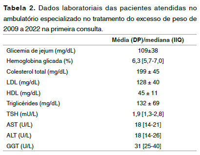 Delineamento do estudo: estudo realizado através da revisão de prontuários das pacientes matriculadas em ambulatório especializado no tratamento do excesso ponderal, que funciona vinculado ao SUS e serve de referência dentro de Instituição de Ensino. O ambulatório é composto por equipe multidisciplinar incluindo endocrinologia, nutrição, psicologia, enfermagem e educação física e faz parte de um projeto de pesquisa em obesidade. Foram analisados os prontuários dos pacientes atendidos entre os anos de 2009 e 2022.