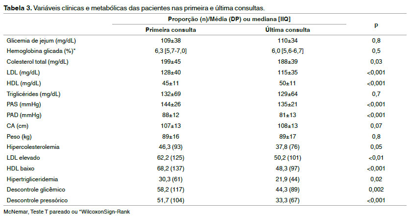 Ao analisar os parâmetros de controle metabólico de todas as pacientes, ao início e final do acompanhamento, detecta-se melhora nos valores de colesterol total, HDLc, LDLc, nos níveis pressóricos e no controle glicêmico (Tabela 3).