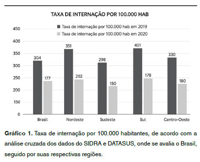 Ocorreu uma redução percentual das internações por 100.000 habitantes no Brasil foi de 41,78%, seguido do Norte com 42,45%, Nordeste com 49,66%, Sudeste com 31,80%, Sul com 48,38%, e Centro-Oeste com 45,45%.