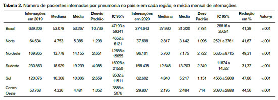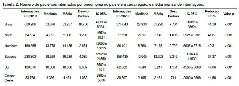 A Tabela 2 demonstra os resultados encontrados, demonstrando o número de pacientes internados por pneumonia no país e por cada região, e a média mensal de internações por pneumonia.